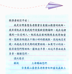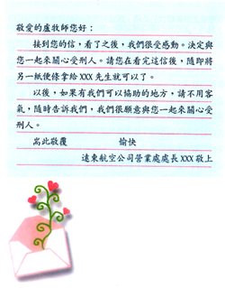 當時飛行台東與台北之間的航空公司,只有遠東一家。我就拿起筆來寫信。我也不知道要寫誰,我的妻子知道我要寫信給航空公司,也持懷疑的態度,因為並不認識任何人。但我知道祈禱是我唯一尋求幫助最好的方法。於是,我開始一面寫信,一面祈禱著上帝牽我的手。信是這樣寫的: