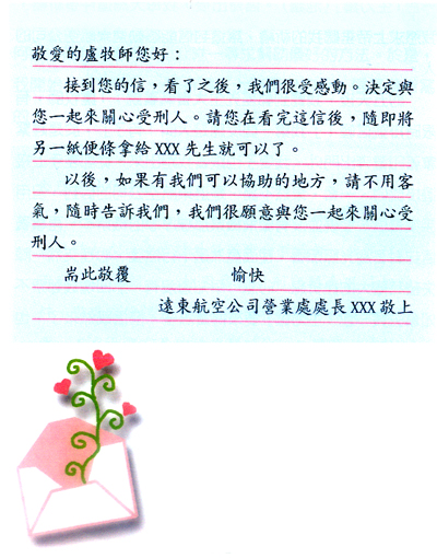 我知道之後,想了很久,想要知道該怎麼幫助這位受刑人?那時,教會給我的謝禮只有四千多元,要幫助他實在有困難。若要向會友借支,又得再述說一次這樣的故事,且不一定借得到,因為鄉下地方,對這種亂倫的事件都比較敏感。最後,我想到寫信給遠東航空。