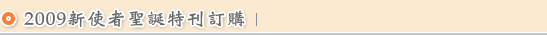 《新使者》雜誌2009年聖誕特刊是卡片書,也是經文年曆,透過平易近人的文字、生動感人的見證,兼以設計精巧的年曆,素為慕道的朋友所喜悅接納,多年來承蒙教會兄姐喜愛珍存,口碑良好,今年尚未出刊,便接獲許多詢問電話,原因無他,正因為此份聖誕禮物書不但可做為傳遞福音信息之用,尚可作為聖誕佳節溫馨問候、探訪;以及教會夾週報、向社區報佳音、寄送旅外親友之用(請參閱所附樣本)。